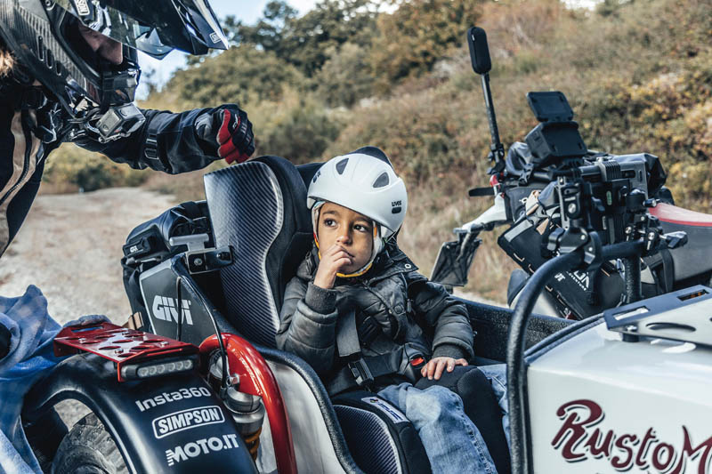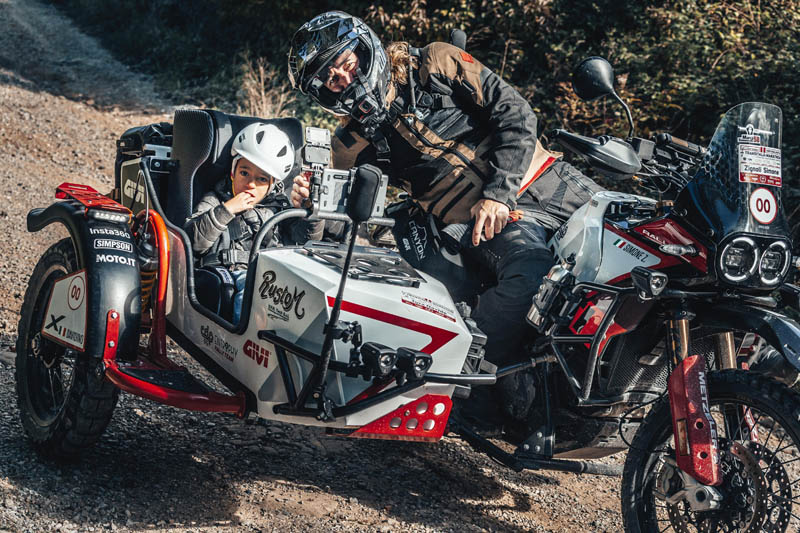 Um diesen Wunsch zu erfüllen, nahm Davide an der Transitalia Marathon an Bord des weltweit ersten Ducati DesertX Rally Sidecars teil, das von VFR Tech und Rustom mit technischer Unterstützung von GIVI entwickelt und gebaut wurde. Dieses einzigartige Fahrzeug wurde konzipiert, um ihm Sicherheit, Stabilität und ein intensives, umfassendes Abenteuererlebnis zu bieten.